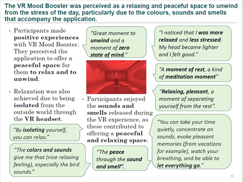 - Before using the VR MoodBooster, several FBTO employees experienced fatigue, tension, stress, concentration problems and irritability at work. During and after the pilot, all these symptoms decreased in frequency and intensity or even disappeared completely. In addition, after taking off the VR headset, FBTO employees reported feeling happier, more cheerful, more productive and more engaged at work.
